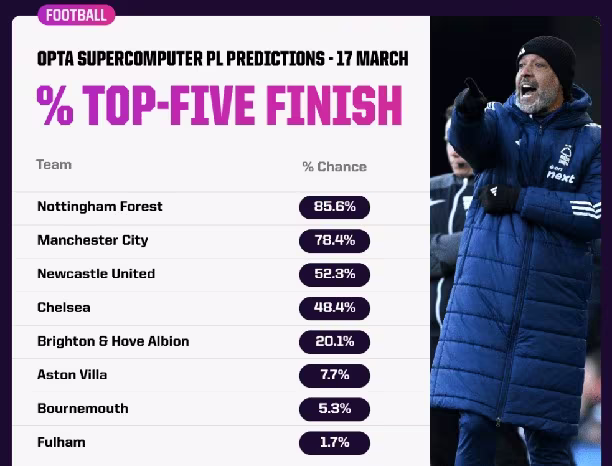 Hiện tại, Chelsea đứng thứ 4 trên bảng xếp hạng với 49 điểm. Tuy nhiên, theo các mô phỏng từ siêu máy tính của Opta, The Blues chỉ có 48,4% cơ hội kết thúc mùa giải trong top 5, thấp hơn so với các đối thủ cạnh tranh như Nottingham Forest (85,6%), Man City (78,4%) và Newcastle (52,3%). Nếu dự đoán này thành sự thật, thầy trò HLV Enzo Maresca sẽ phải chấp nhận suất dự Europa League thay vì Champions League.
