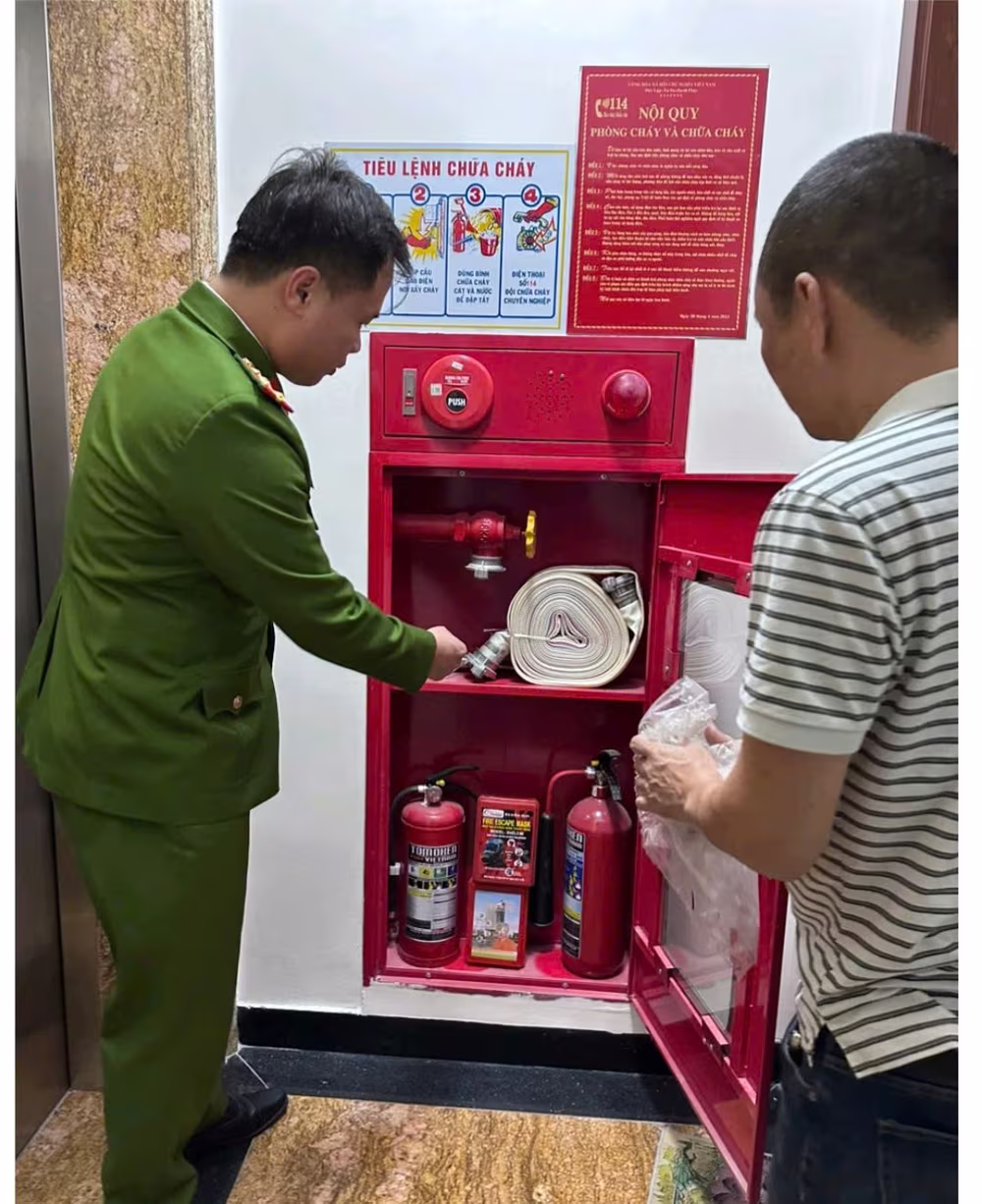 Cán bộ tổ địa bàn PCCC và CNCH Long Biên kiểm tra thiết bị an toàn PCCC tại công trình trong diện rà soát |